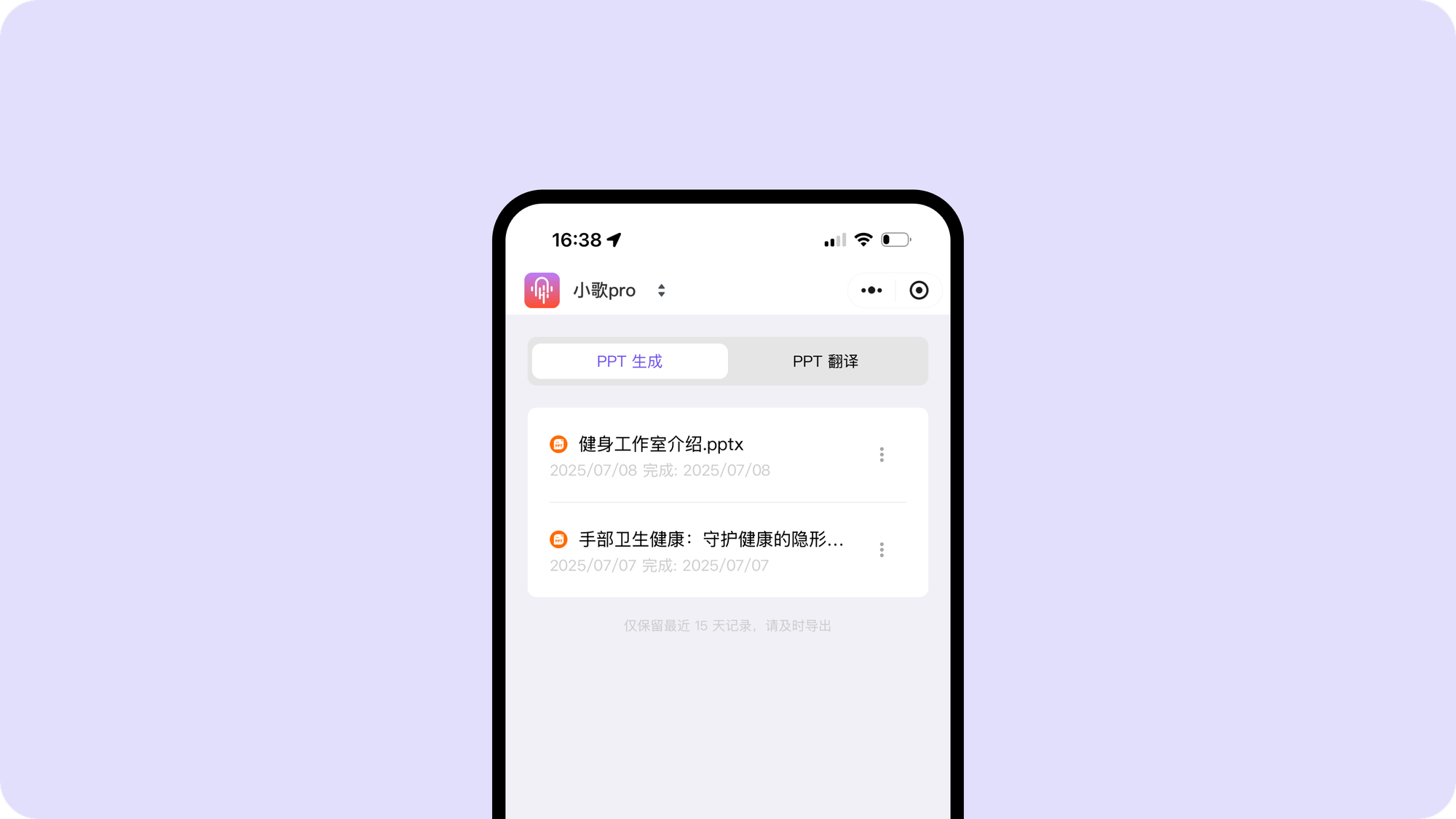 系统会自动保存最近 15 天内生成或翻译的 PPT 文件,你可以在这里随时查看或转发分享。
