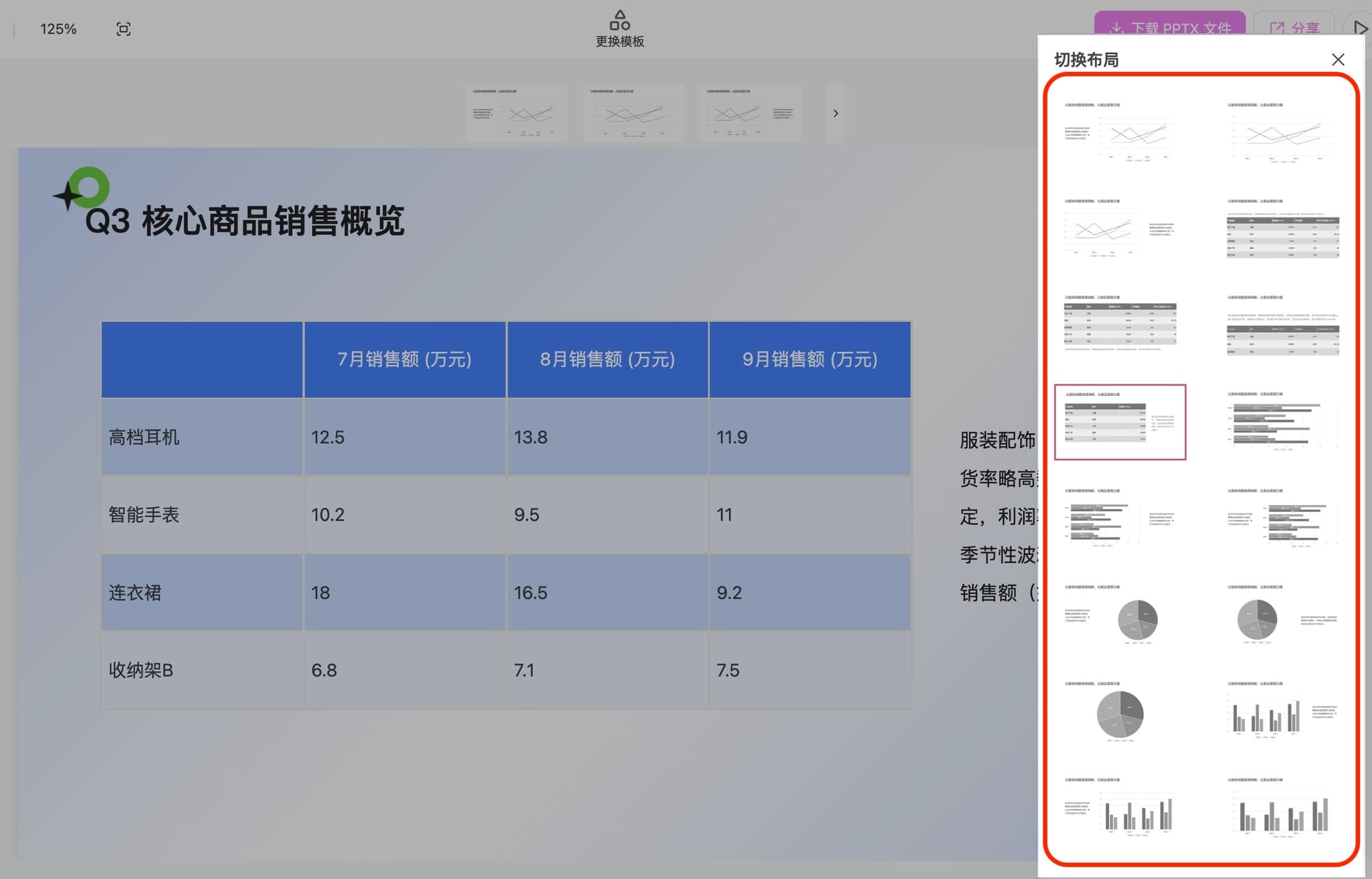 3.若想切换图表样式,点击「切换布局」,先在侧边栏中选择一个带表格的版式(把当前页切换为表格版式);切换后,侧边栏会展示对应的图表样式选项(柱状、折线、饼图、条形等),直接点击所需图表版式即可一键替换;