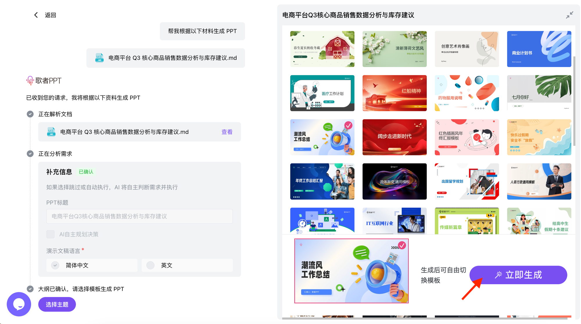 2.确认资料和模板后,点击生成 PPT,歌者会自动将符合条件的表格转成合适的图表;