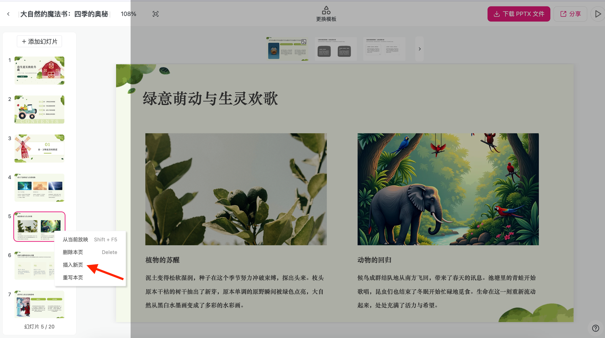 1.打开生成好的 PPT,找到想要插入新页的位置,选中它的前一页,单击鼠标左键,在菜单中点击「插入新页」;