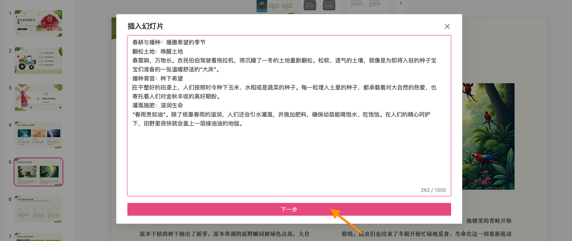 2.输入新页的文本内容,确认内容后,点击「下一步」进行幻灯片类型选择;