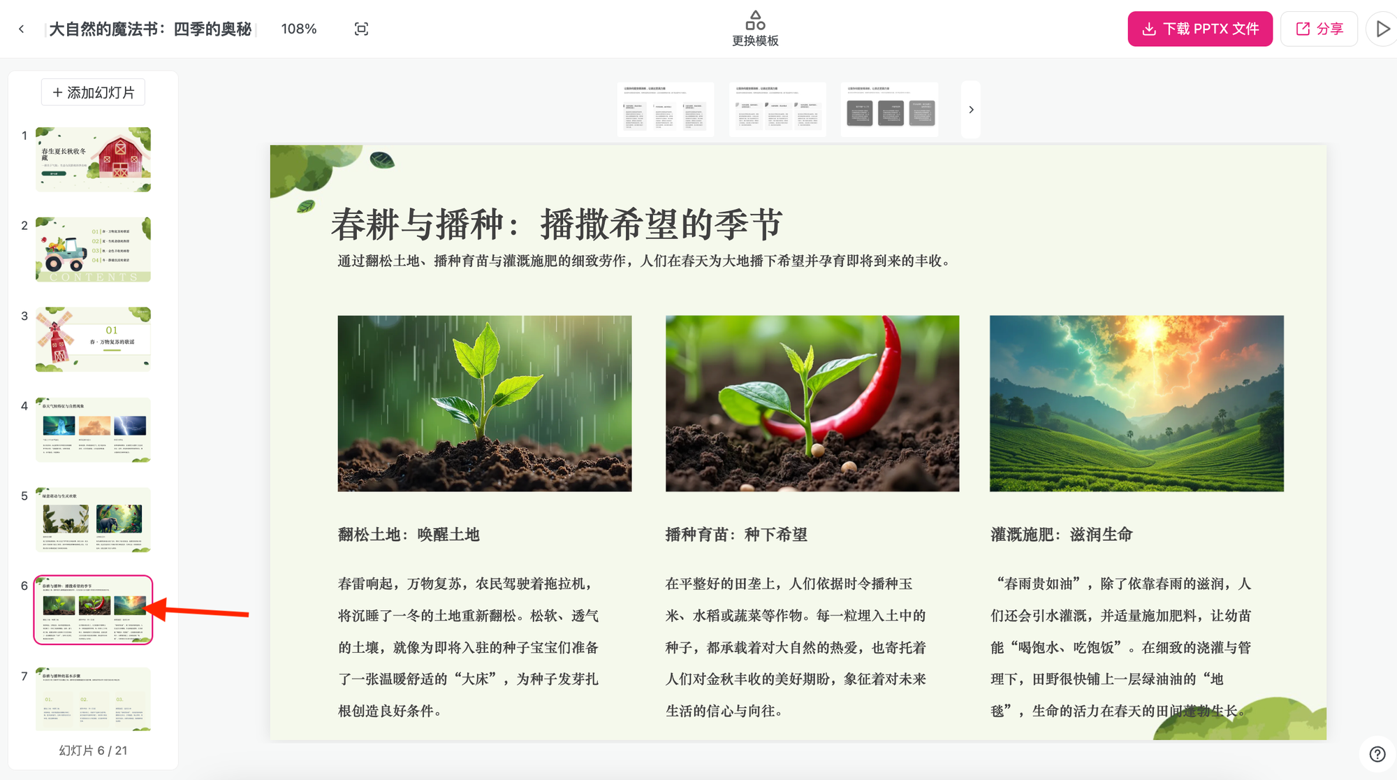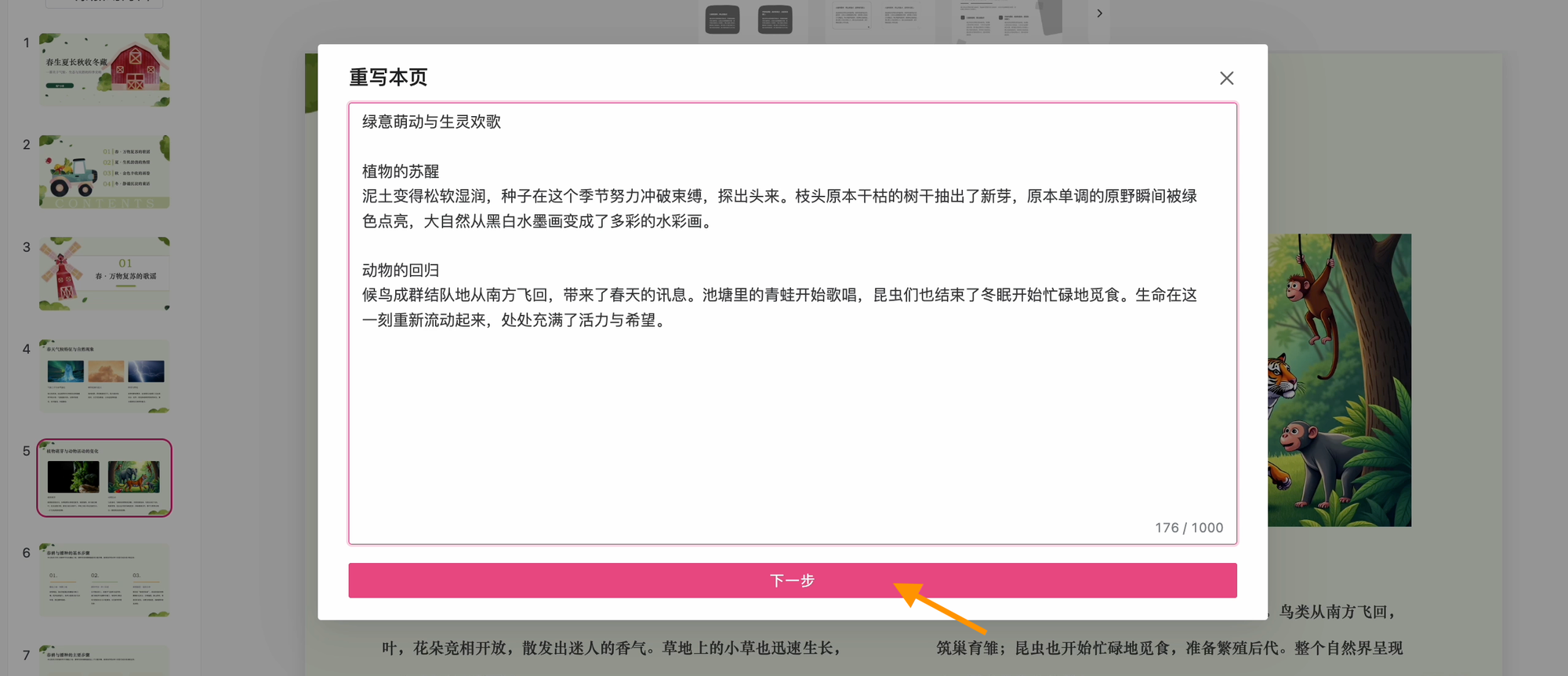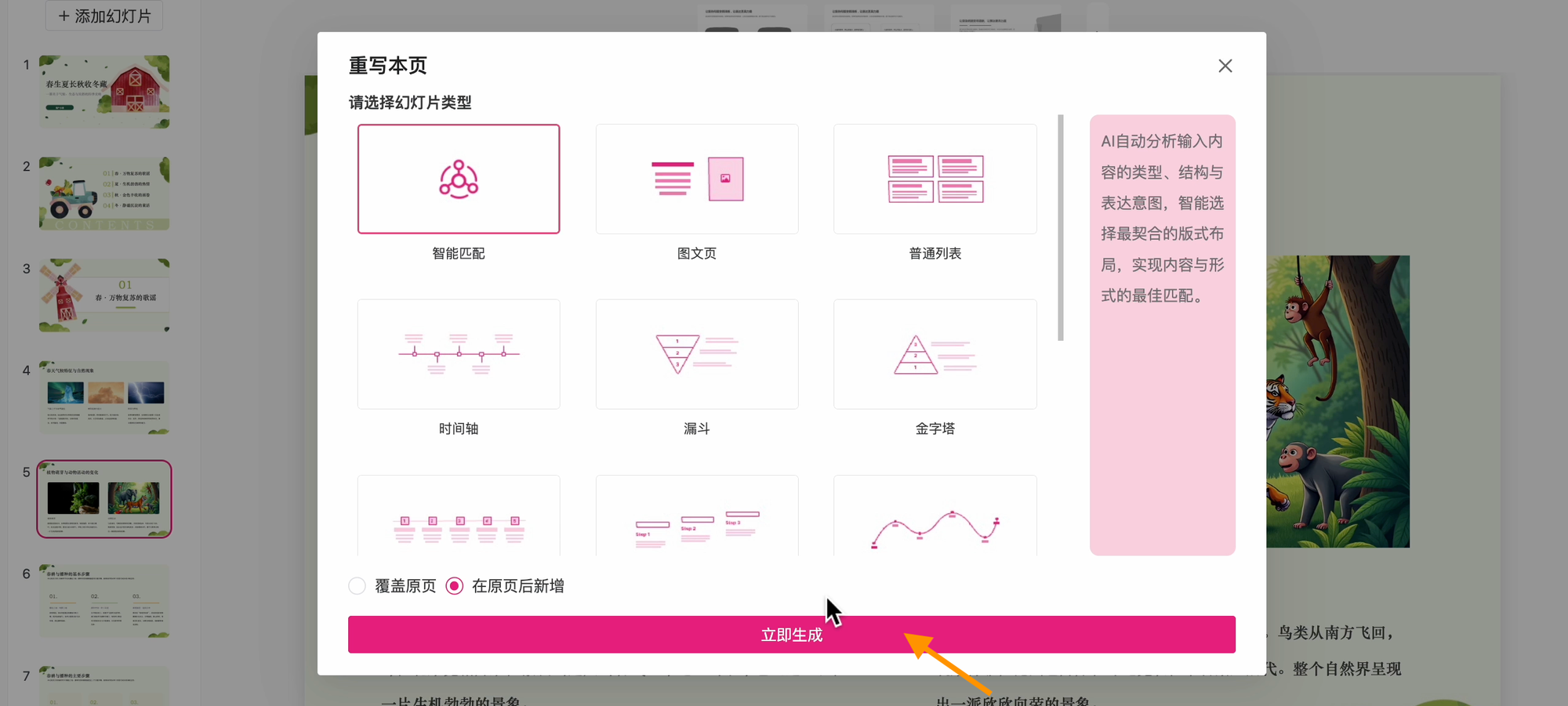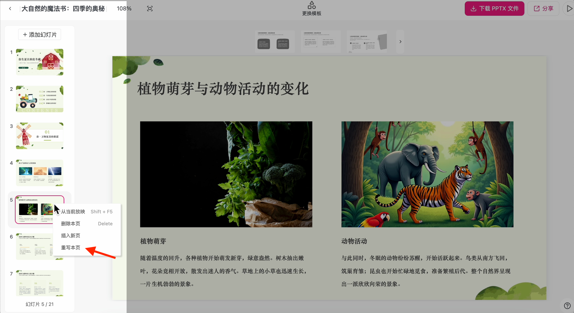 当你对某一页的内容不够满意时,使用「重写本页」就能快速替换这一页,省去重新生成整份 PPT 的麻烦。