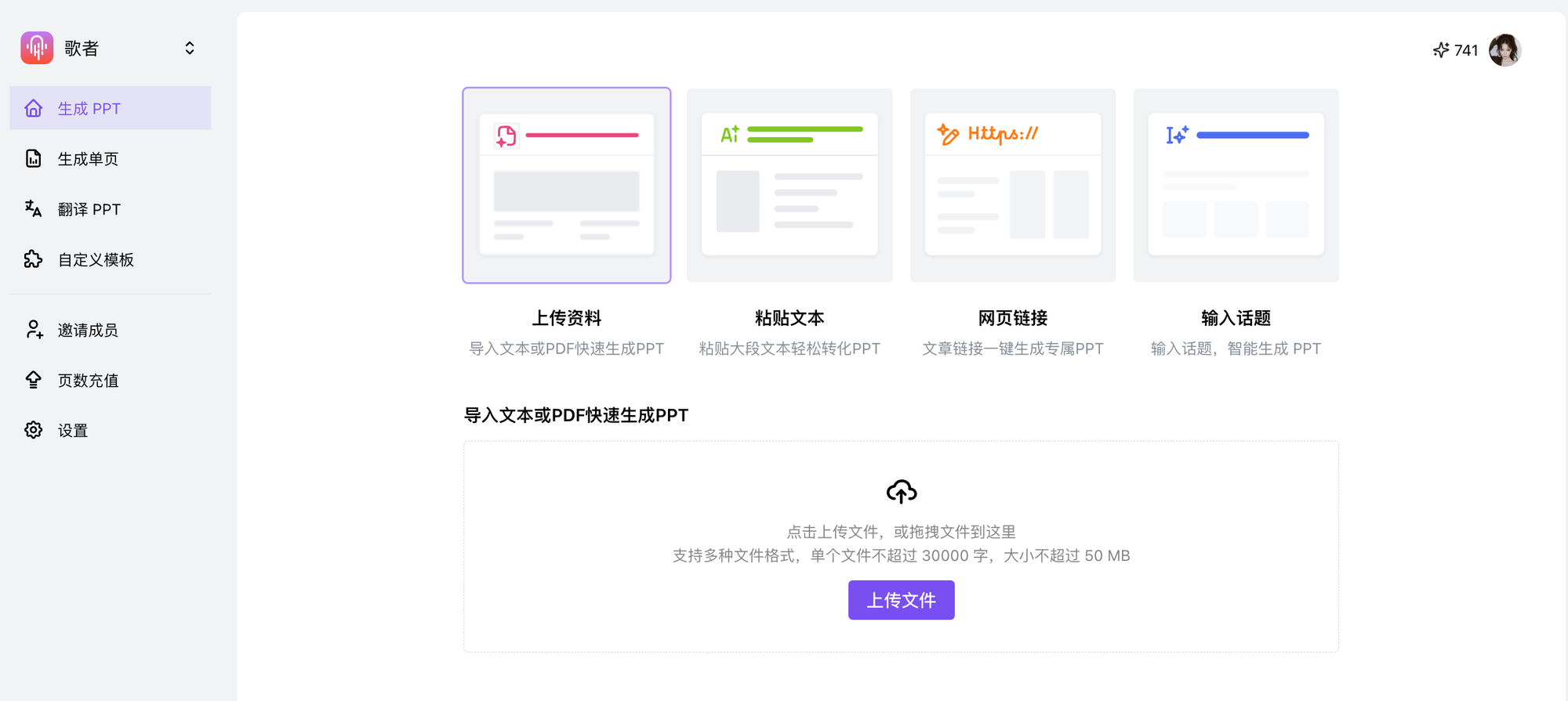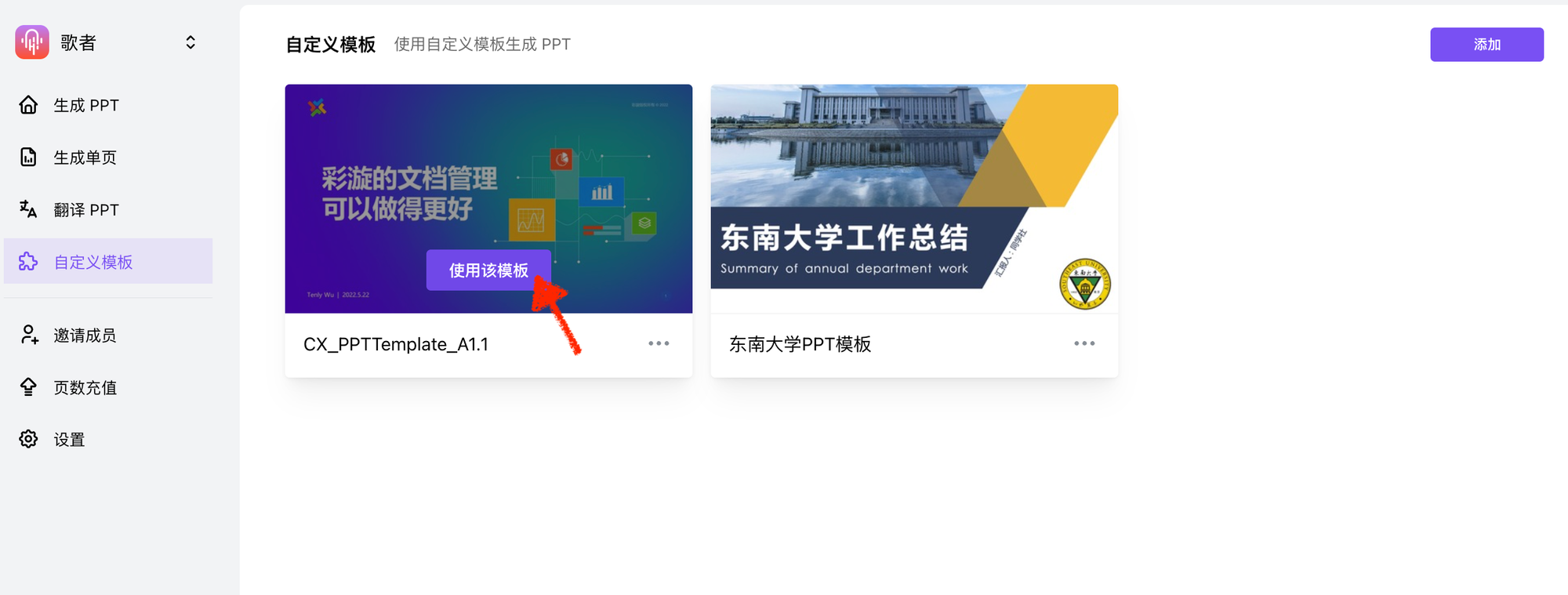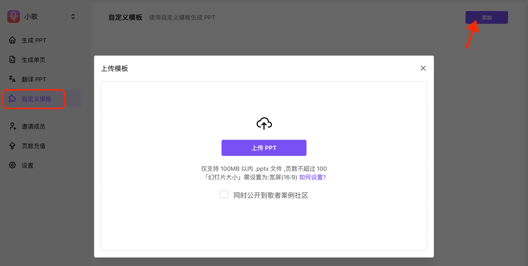 - 登录歌者,在左侧导航栏找到「自定义模板」并点击进入,随后上传你的本地 PPT 模板文件;