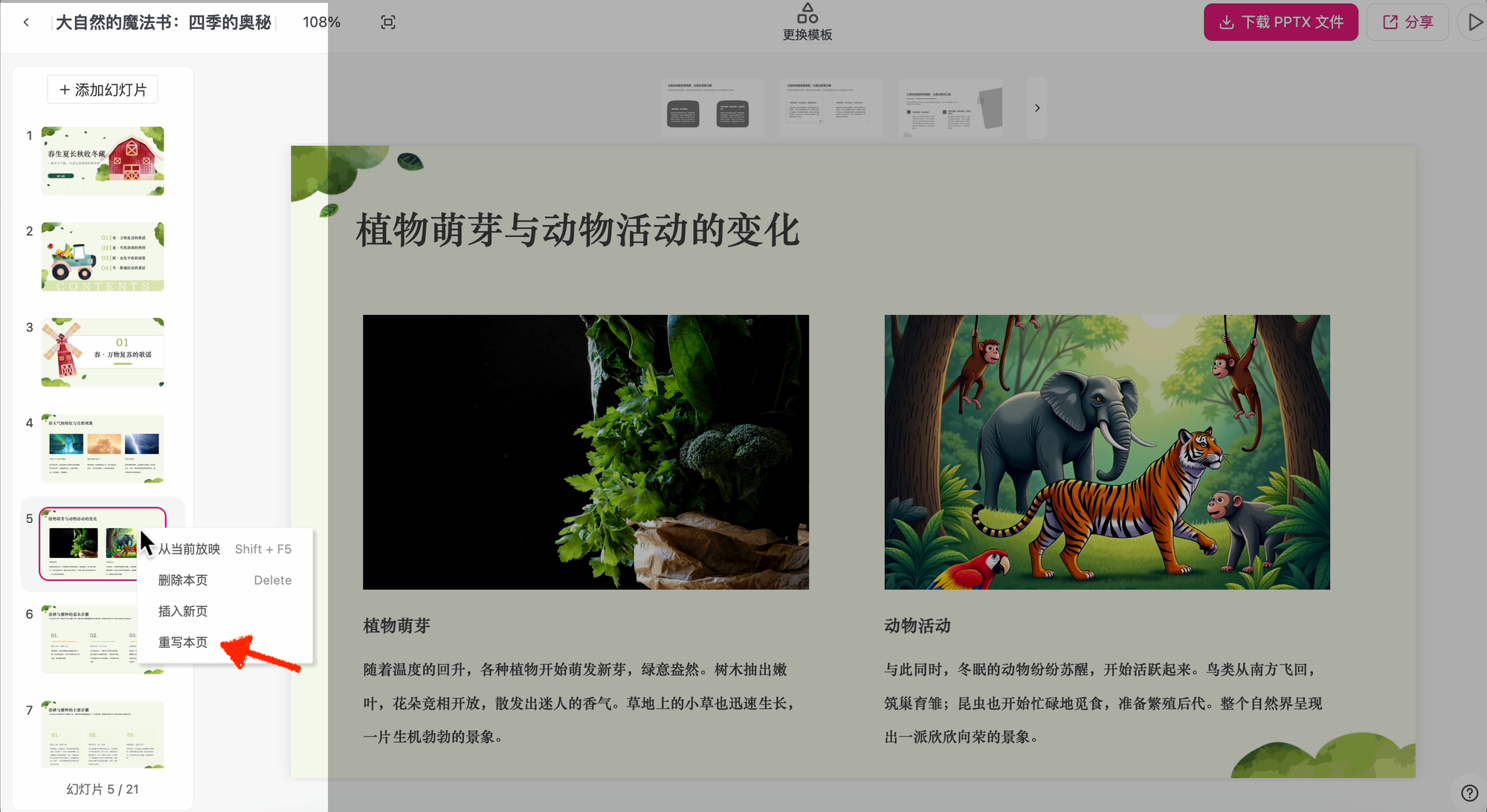 整份 PPT 已经生成完毕,但发现其中某一页的内容或排版不够完美?不用推翻重来!「重写本页」功能让你精准调整。
