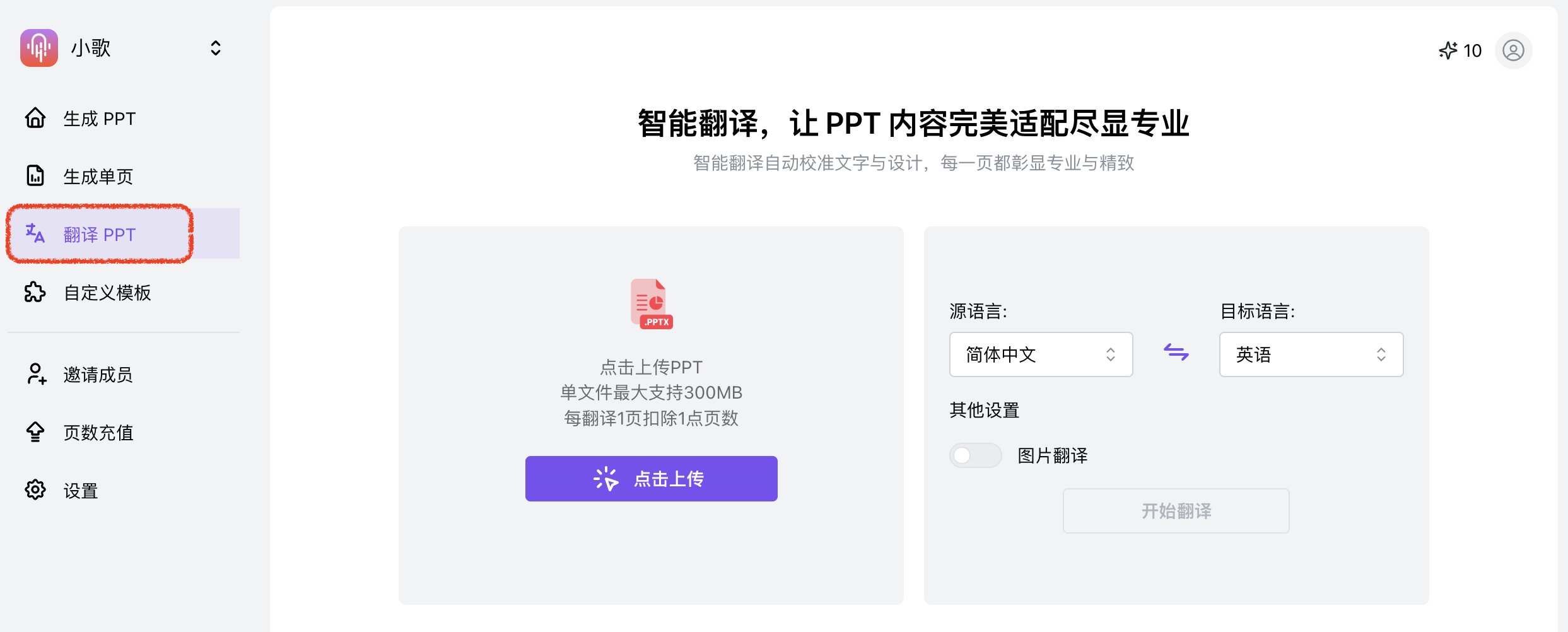 - 进入歌者,在左侧边栏找到「翻译PPT」功能;