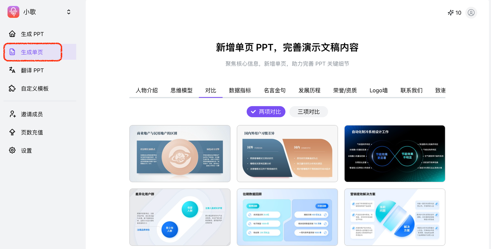 有时候,我们并不需要一整份完整的演示文稿,只是想快速做一张“数据对比图”、一页“发展历程”时间轴、或者一份高大上的“人物介绍”?「生成单页」功能就是为你量身定做的!