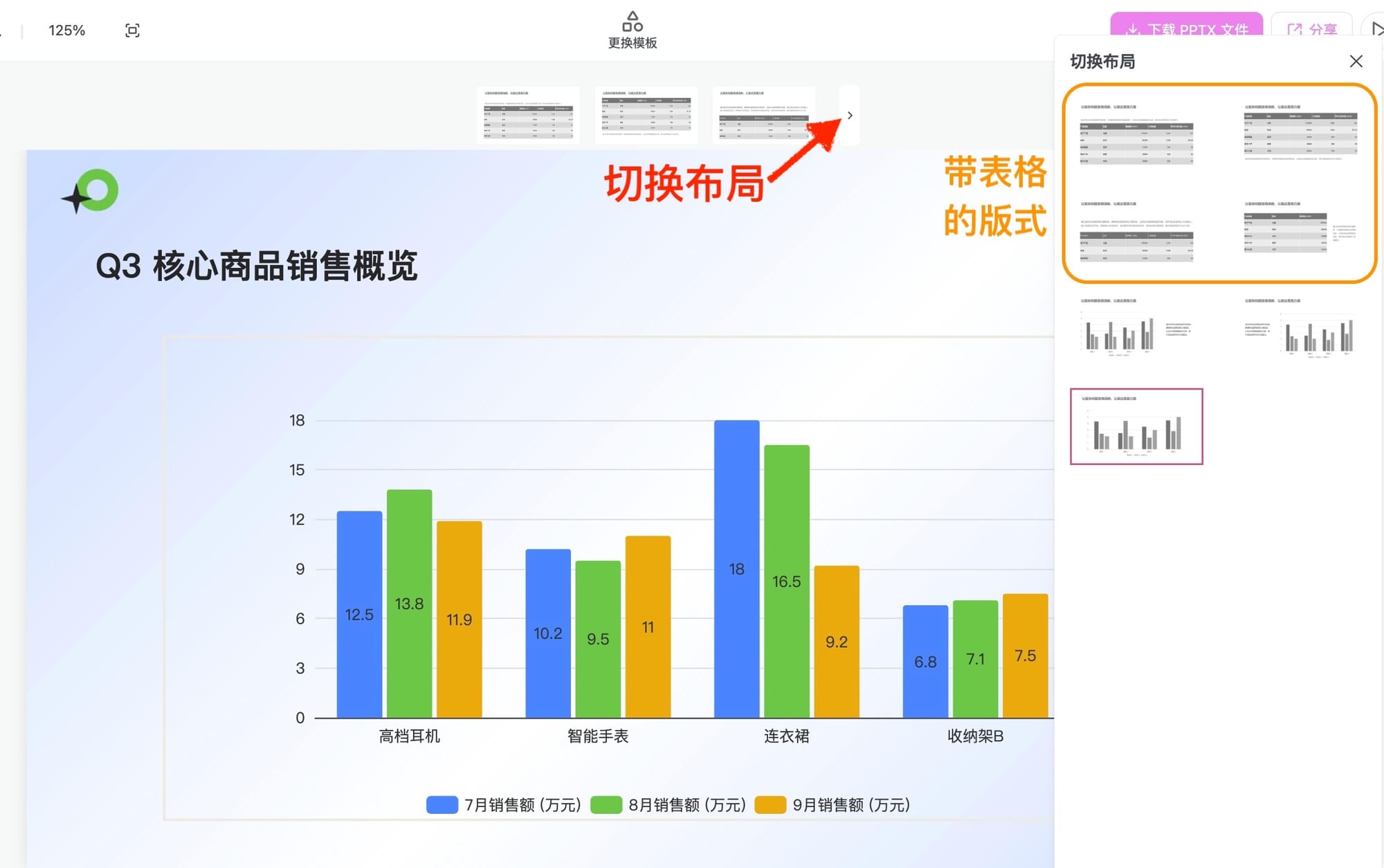 - 生成后,如果想更换图表的展现形式,只需点击「切换布局」,先在侧边栏中选择一个带表格的版式(把当前页切换为表格版式);然后,侧边栏会展示对应的图表样式选项,直接点击所需图表版式即可一键替换。