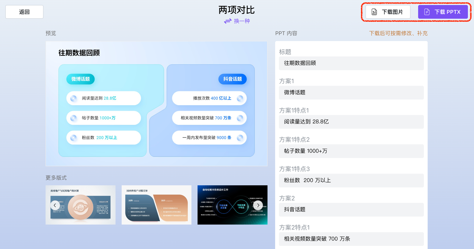 - 完成后即可直接下载高质量图片,或导出 PPTX 格式,非常轻量便捷!