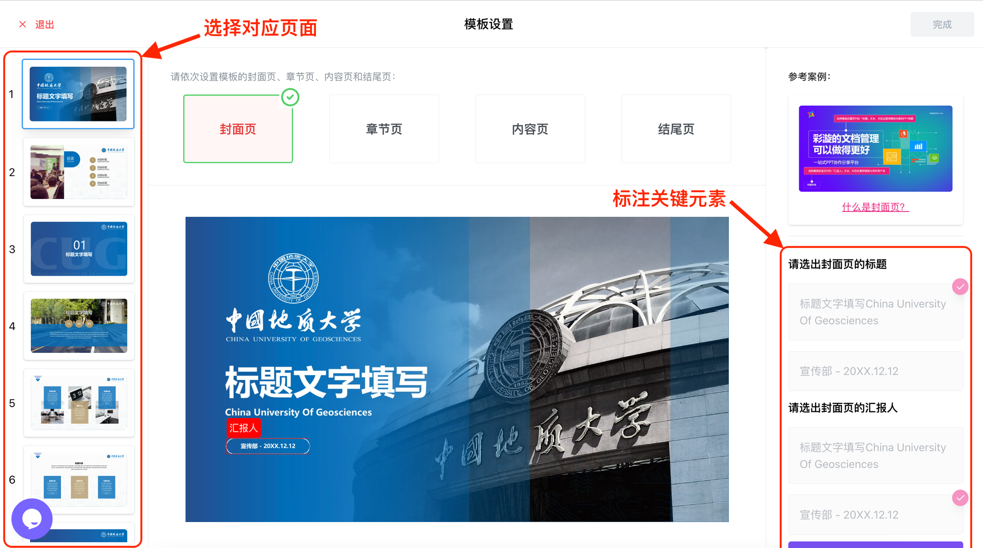 上传完成后,需要手动设置页面类型。选择模板中的封面页、章节页、内容页和结尾页,并在对应页面上标注关键元素(如标题、汇报人、序号等)。