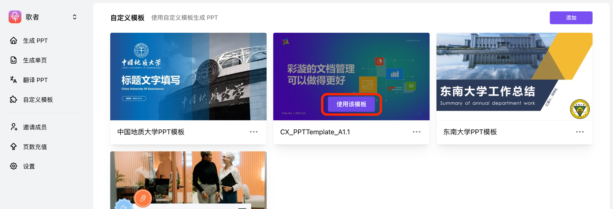 登录歌者,点击「自定义模板」→「添加」,将准备好的 PPT 模板上传。