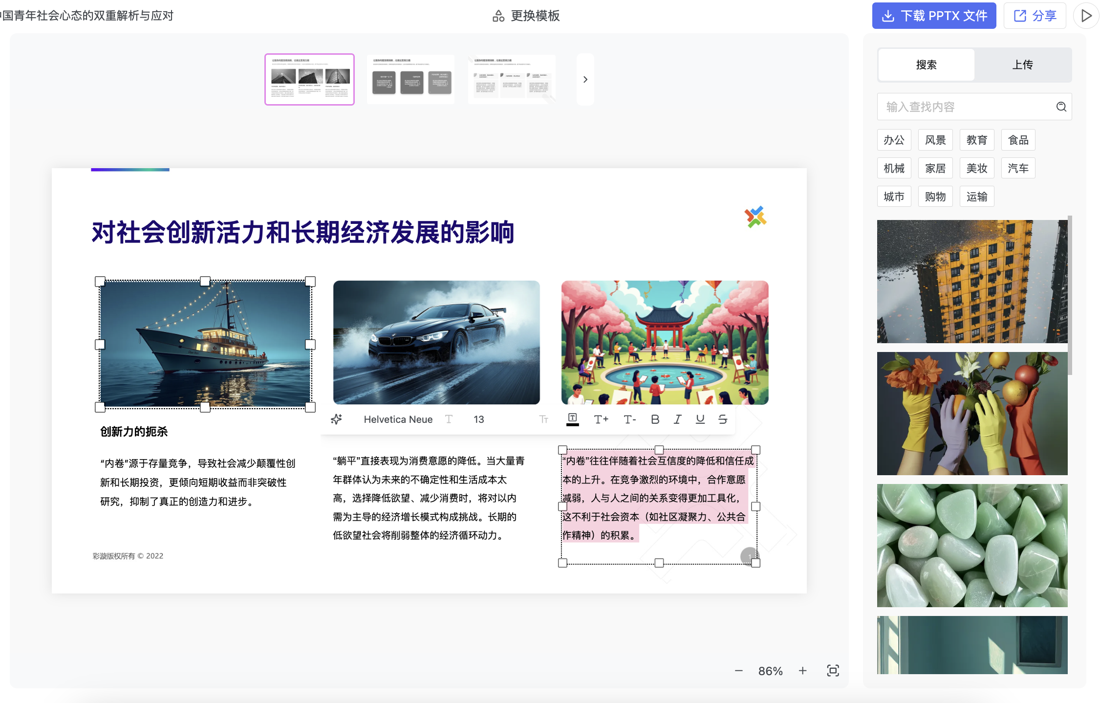 生成好的 PPT 还能在歌者内直接修改,包括:更换模板和版式、编辑文字(字号、字体、颜色、加粗等都可调整)、替换配图(侧栏搜索或上传本地图片)、或使用 AI 润色功能优化段落语言。所有修改完成后,一键下载 PPTX 文件,即可在本地直接使用或继续编辑。