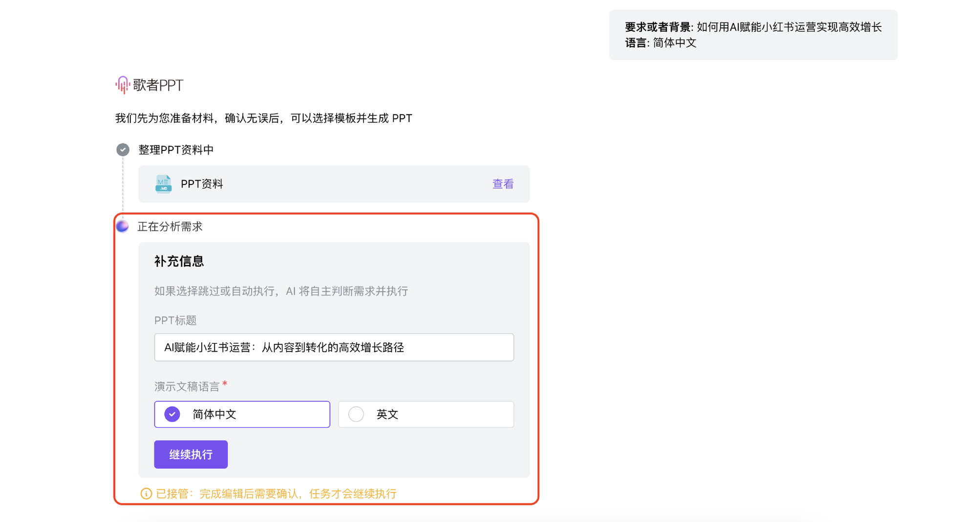 在确认 PPT 资料后,用户可以修改并确认 PPT 标题、选择生成的语言(目前支持中文/英文)。如果选择跳过或自动执行,AI 将自主判断并根据需求继续生成。