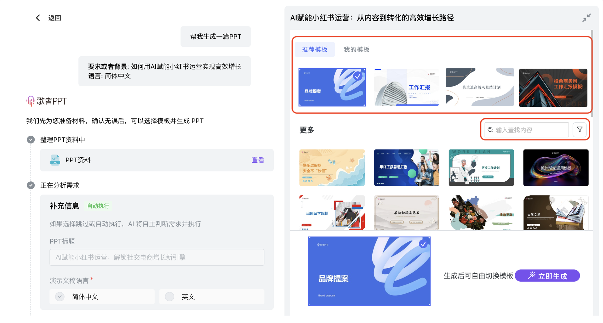 确认 PPT 内容后,AI 会根据主题内容自动推荐歌者模板库中契合的 PPT 模板。用户可以直接在推荐栏快速浏览匹配的模板,选择合适的再进入生成流程。