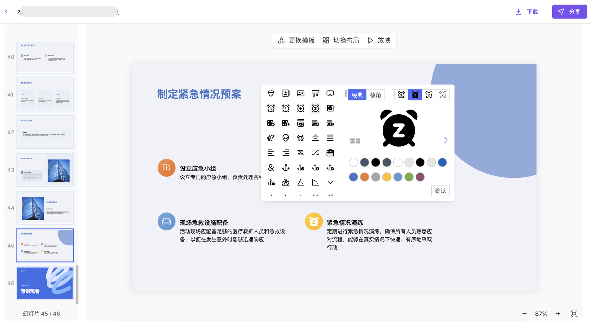 生成 PPT 后 → 找到含有 icon 的版式 → 点击 icon → 选择替换或调整 icon 风格与颜色