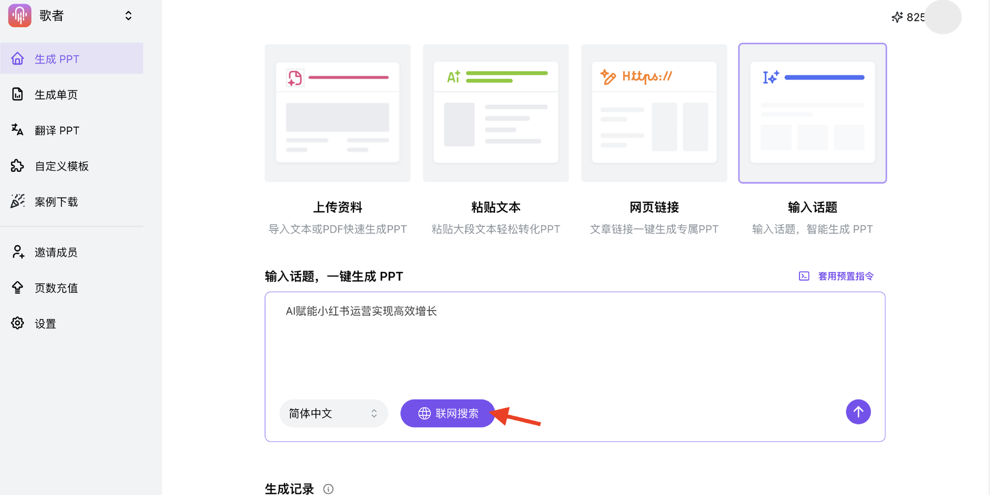 登录歌者 → 选择「输入话题」 → 输入主题后在底部开启「联网搜索」